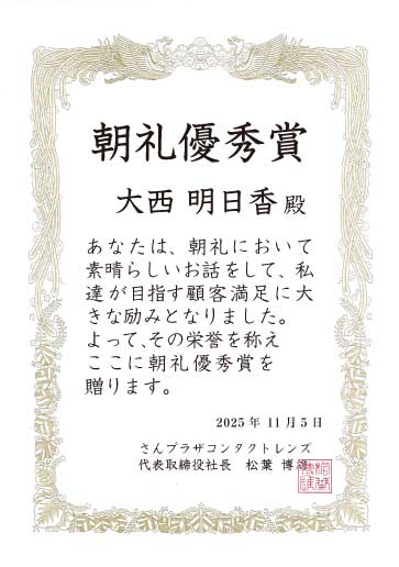 「気配りの行き届いた接客を」朝礼優秀賞 神戸三宮 松葉眼科 さんプラザコンタクトレンズ