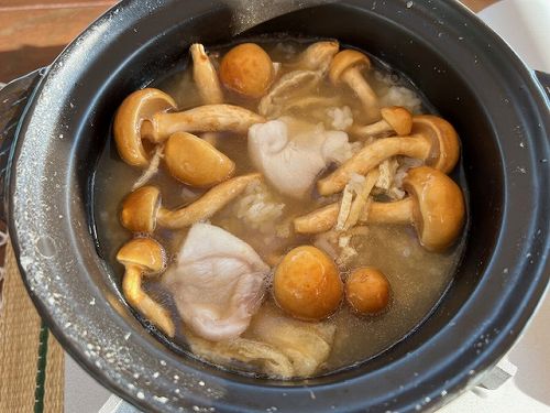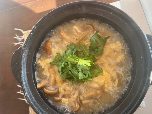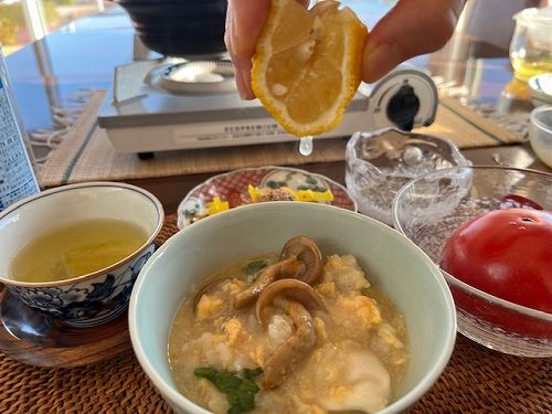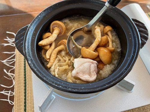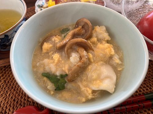 淡路市岩屋 社長の朝ごはん 昨夜の鍋の出汁を使って、贅沢なめこ雑炊