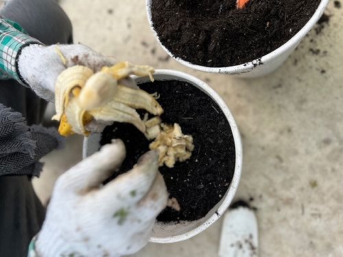 土を入れて軽くくぼみを作ります。