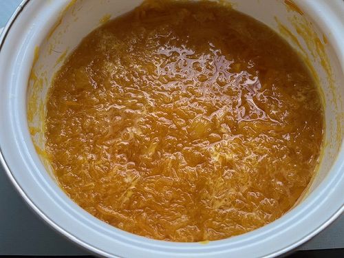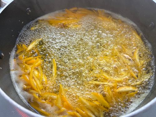 ⑤皮の部分と、果実、果汁、レモン、グラニュー糖を入れ煮ます。