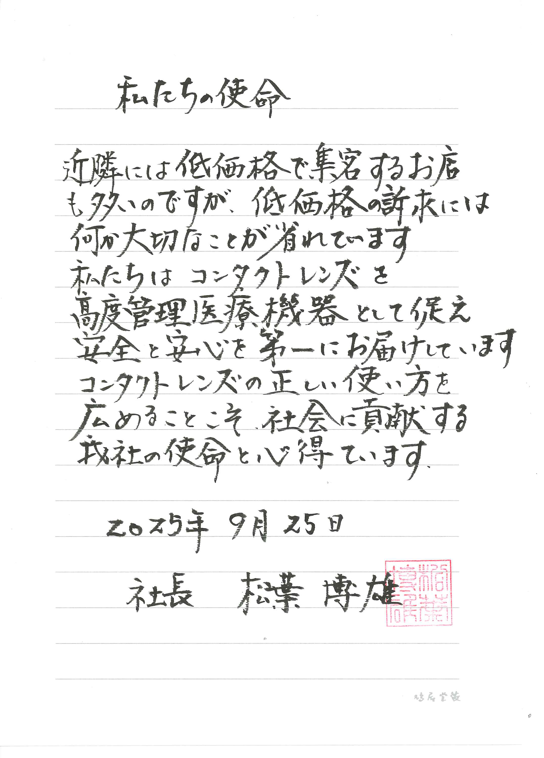 「私たちの使命」 2025年9月 給与袋に添えて 社長メッセージ さんプラザコンタクトレンズ