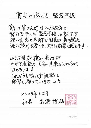 賞与に添えて 社長メッセージ 賞与は皆さんの挑戦と努力で示した「堅忍不抜」の証です